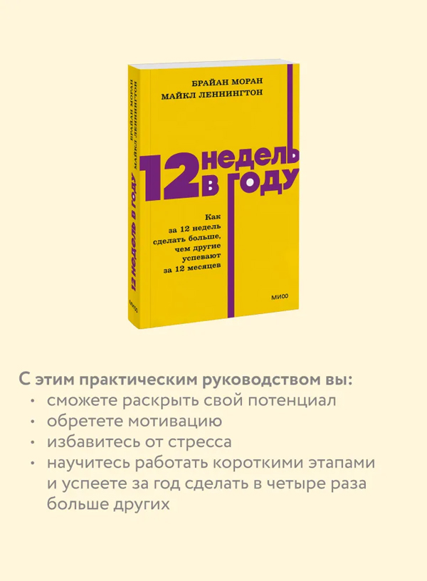 Новое издание книги "12 недель в году. Как за 12 недель сделать больше, чем другие успевают за 12 месяцев". Авторы книги — практикующие бизнес-тренеры и консультанты — предлагают подход, который полностью изменит ваш образ мышления. Главное — не результаты, а действия, которые привели к ним.