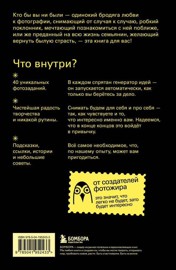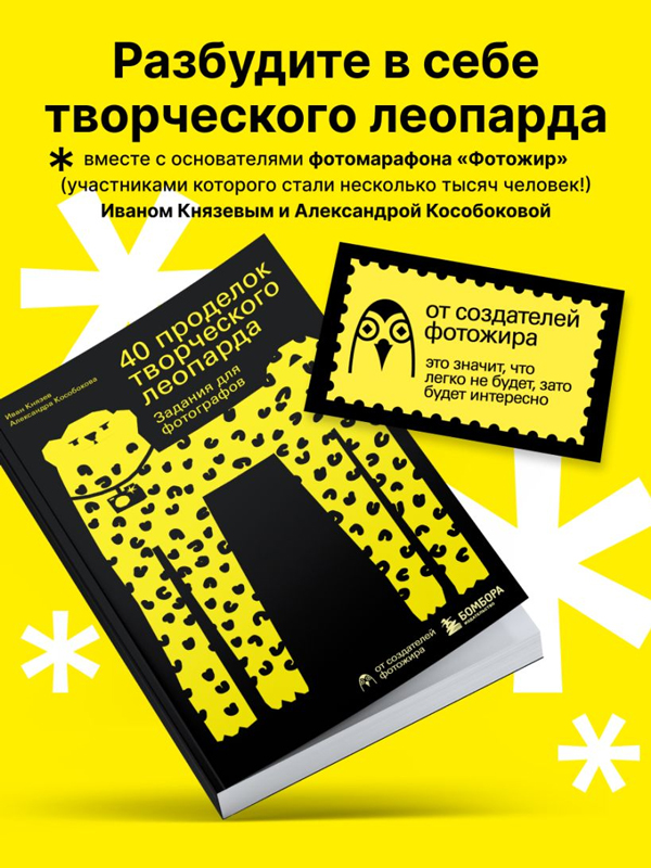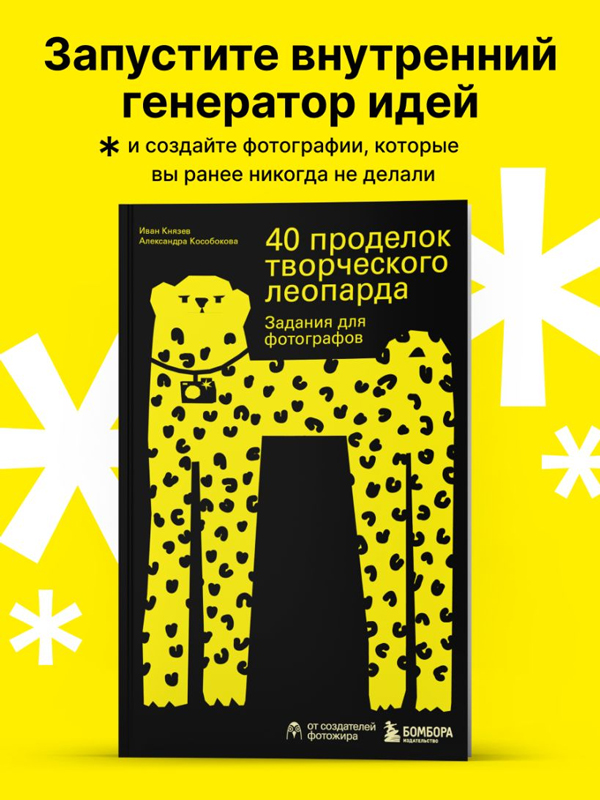 Если вы попали в творческий кризис, то эта книга станет спасением для вас и вашего фотоаппарата! Основатели фотомарафона «Фотожир» (участниками которого стали несколько тысяч человек!) Иван Князев и Александра Кособокова собрали здесь удивительные задания, которые вам точно раньше не встречались. Они помогут вам не только развить воображение, но и открыть новые грани своего творческого «я».