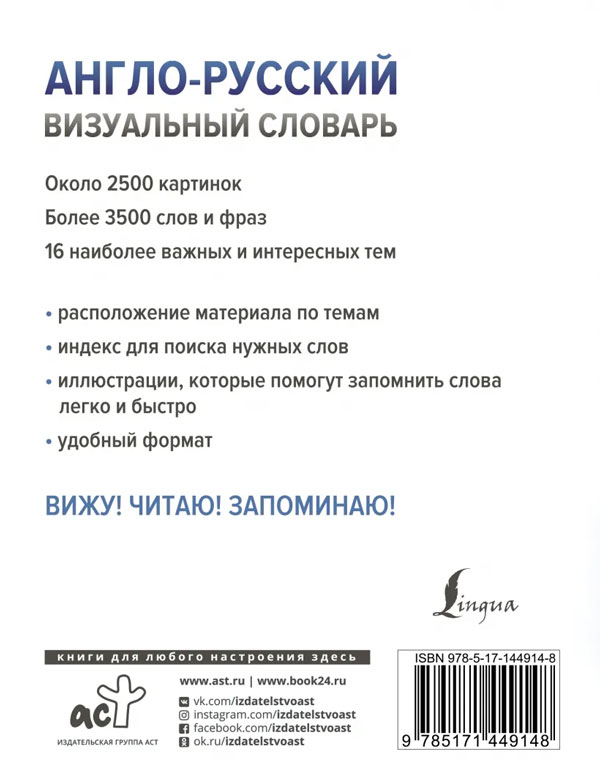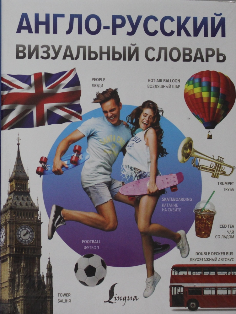 Англо-русский визуальный словарь содержит около 2500 иллюстраций и более 3500 слов и употребительных фраз. Достаточно подробно освещены 16 тем, среди которых Обучение, Дом, Общественное питание, Покупки, Спорт, Досуг и др.