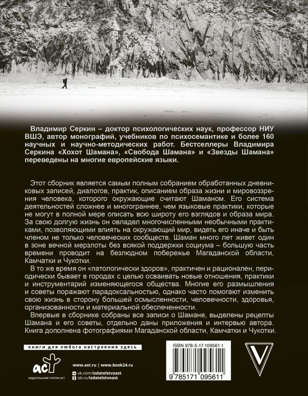 Этот сборник является самым полным собранием обработанных дневниковых записей, диалогов, практик, описанием образа жизни и мировоззрения человека, которого окружающие считают Шаманом. Его система деятельностей сложнее и многограннее, чем языковые практики, которые не могут в полной мере описать всю широту его взглядов и образа мира. За свою долгую жизнь он овладел многочисленными необычными практиками, позволяющими влиять на окружающий мир, видеть его иначе и быть членом не только человеческих сообществ. Шаман много лет живет один в зоне вечной мерзлоты без всякой поддержки социума — большую часть времени проводит на безлюдном побережье Магаданской области, Камчатки и Чукотки.