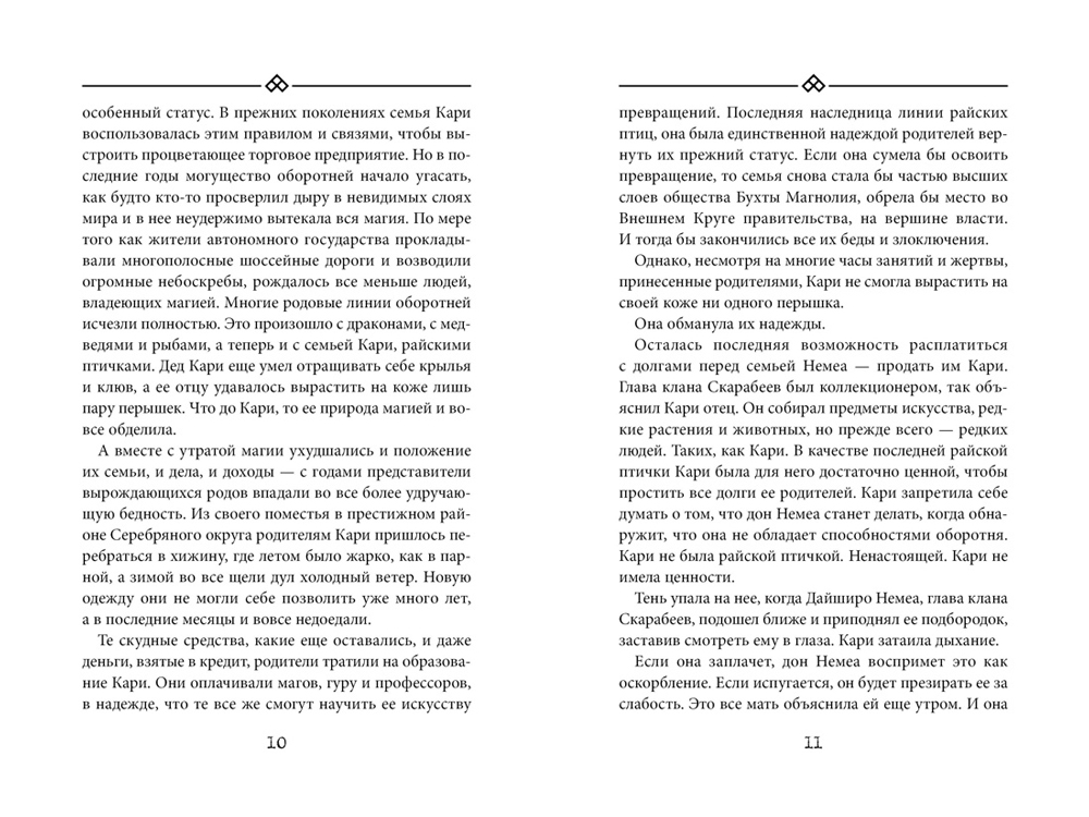 Безжалостный боец клана Скарабеев, яркая красавица с волосами цвета магнолии Кари Немеа связана со своей родной семьей невидимыми узами. Она последняя из рода райских птиц — оборотней, в стародавние времена имевших высокий статус в Бухте Магнолия. Жаль только, что, как ни старалась, Кари не смогла вырастить на коже ни перышка — райские пташки не поют в неволе.