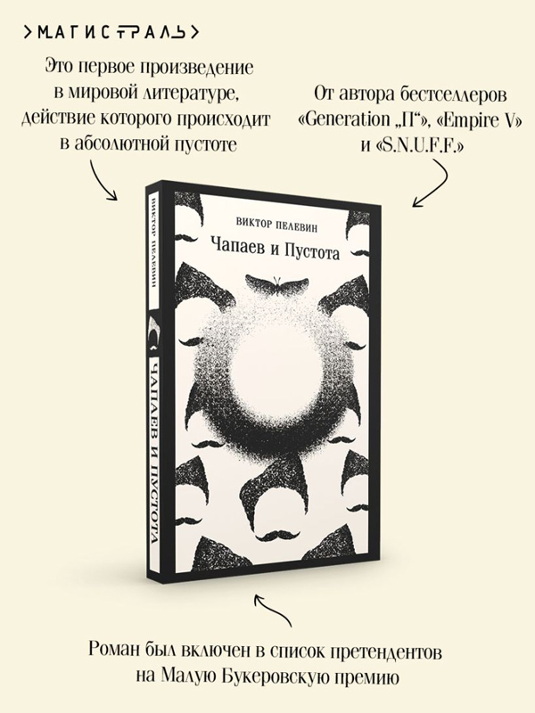 Роман «Чапаев и Пустота» сам автор характеризует так: «Это первое произведение в мировой литературе, действие которого происходит в абсолютной пустоте». На самом деле оно происходит в 1919 году в дивизии Чапаева, в которой главный герой, поэт-декадент Петр Пустота, служит комиссаром. А также в наши дни. А также, как и всегда у Пелевина, в виртуальном пространстве, где с главным героем встречаются Кавабата, Шварценеггер, «просто Мария»…
