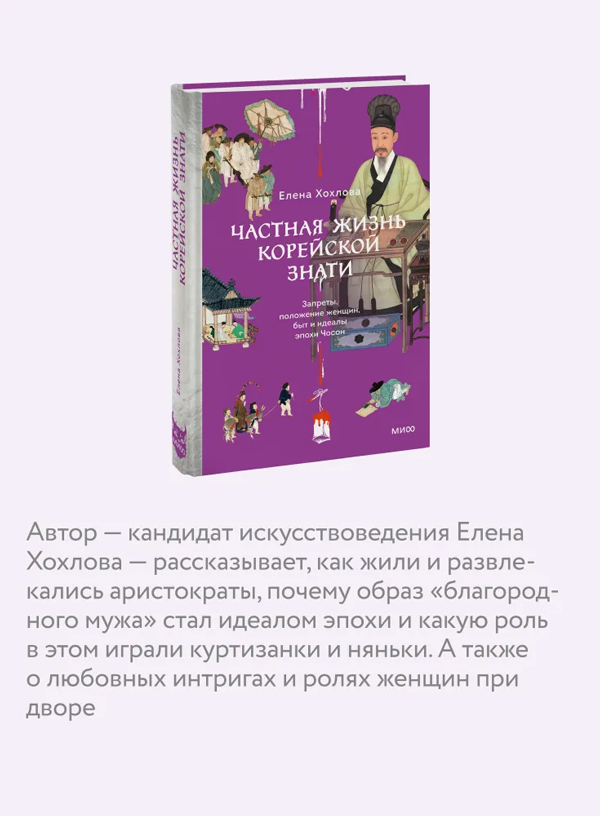 Что скрывалось за расписными ширмами, шелковыми халатами и безупречными поклонами эпохи Чосон (1392–1897)? В этой книге вас ждет увлекательное путешествие в частную жизнь корейской знати. Автор рассказывает, как жили и развлекались аристократы, почему образ "благородного мужа" стал идеалом эпохи, и какую роль в этом играли куртизанки, няньки и даже собаки с петухами. А также о ролях женщин при дворе, любовных интригах и семейных трагедиях.
