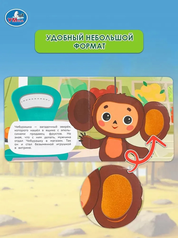 Картонная книга с тактильными элементами «Чебурашка» ТМ «УМка» станет прекрасным подарком для маленького поклонника мультфильмов студии «Союзмультфильм»: