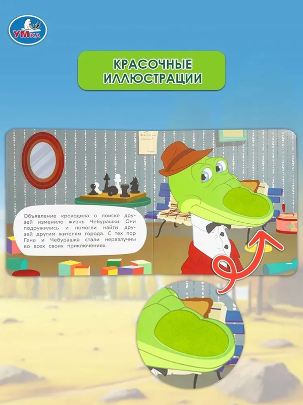 Книжка с красивыми иллюстрациями и увлекательной историей про приключения милого ушастика Чебурашки непременно понравится малышу. Для привлечения большего внимания ребёнка к книге и развития его сенсорики у данного издания имеется тактильный элемент из приятных на ощупь материалов. Благодаря компактному размеру книжку удобно брать повсюду с собой.
