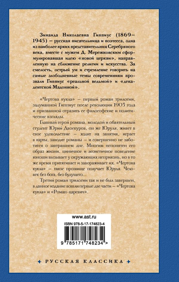 "Чертова кукла" – первый роман трилогии, задуманной Гиппиус после революции 1905 года и призванной отразить ее философские и политические взгляды.