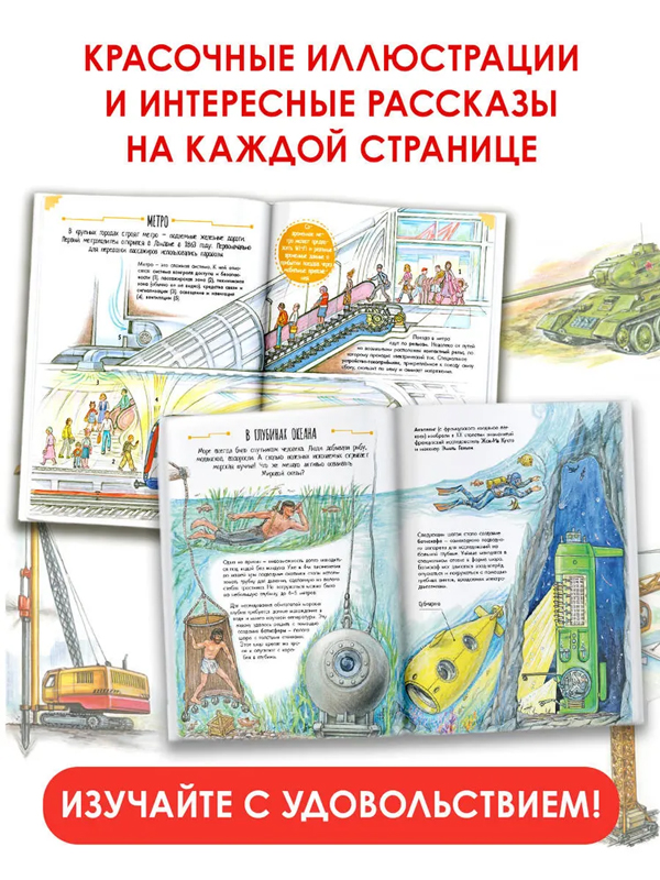 - Яркие, детальные иллюстрации — техника оживает в картинках: разглядывай танки, подводные лодки и компьютеры!