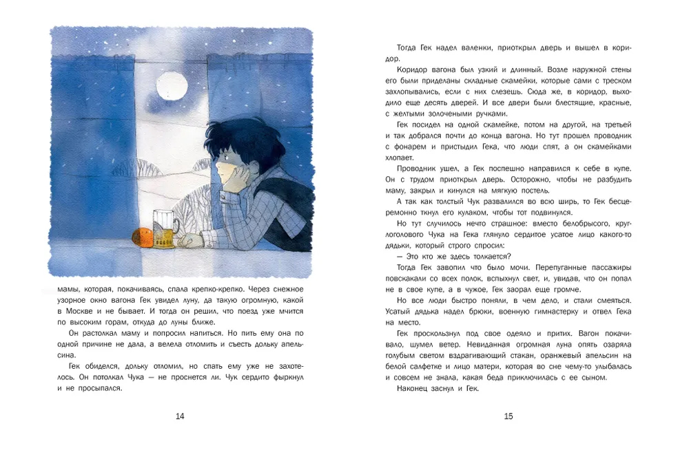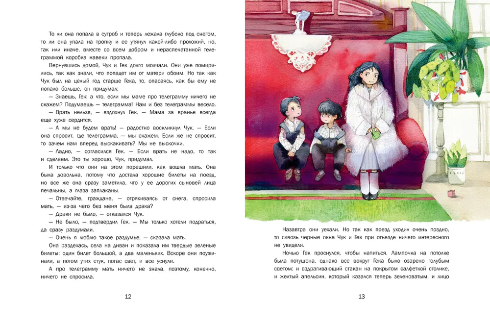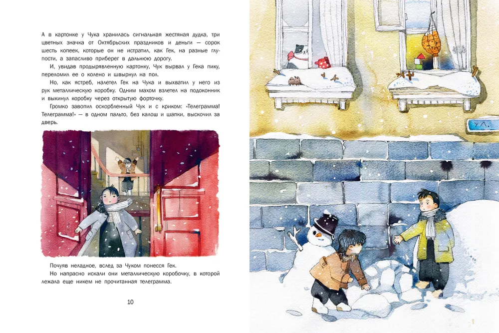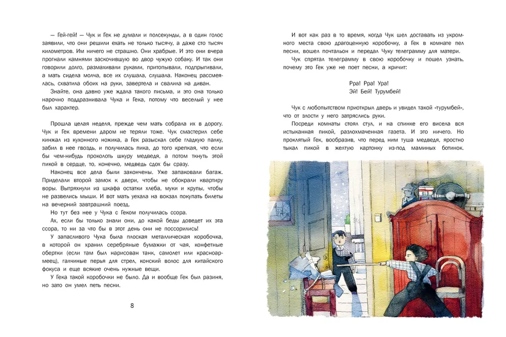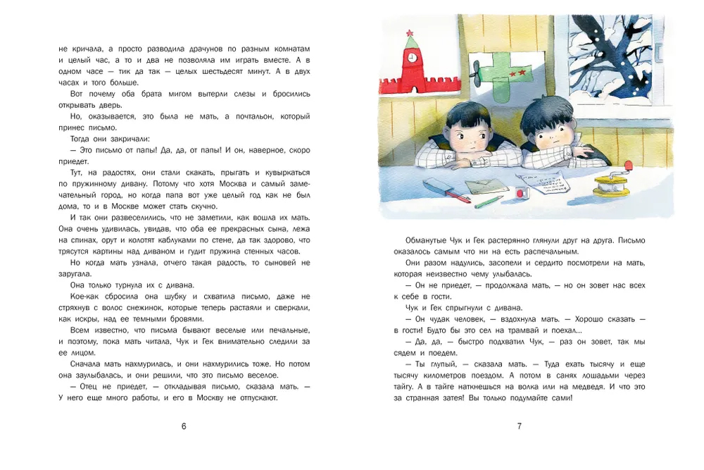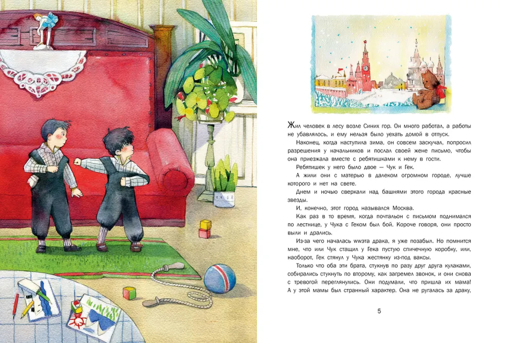"Чук и Гек" одно из самых известных его произведений про двух братьев, которые получают письмо от папы — геолога — из далекой тайги, что он ждет их к себе в гости. И тогда мальчишки вместе с мамой отправляются за тысячи километров в бескрайнюю заснеженную тайгу к Синим горам. Но по приезде оказывается, что была еще и телеграмма (в драке Чук и Гек случайно выбросили ее из окна), в которой отец просит отложить приезд на некоторое время. И тут начинается самое интересное…