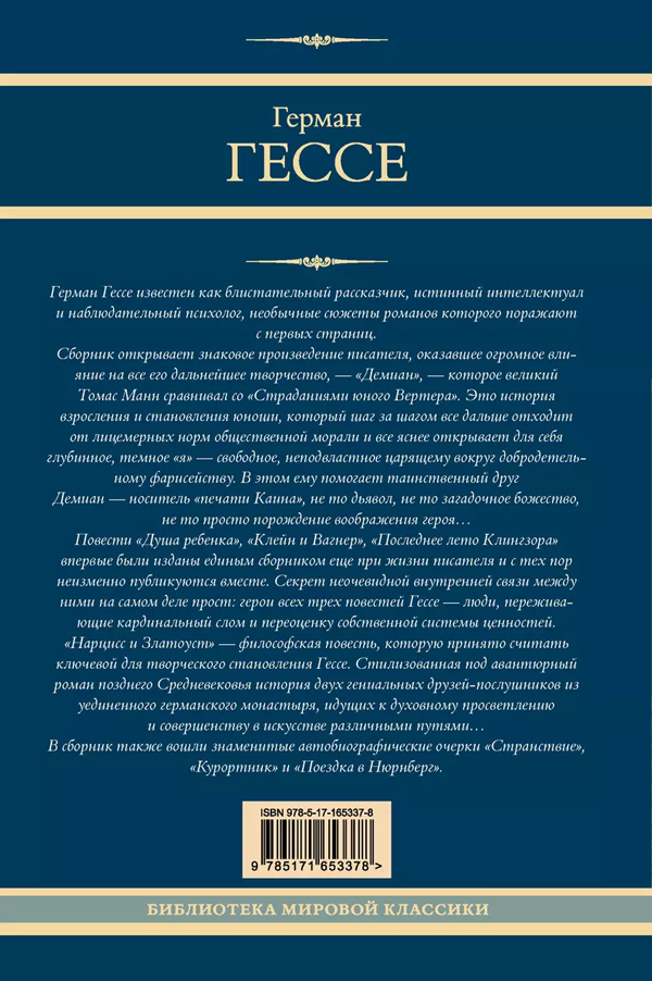 Сборник открывает знаковое произведение писателя, оказавшее огромное влияние на все его дальнейшее творчество, — «Демиан», — которое великий Томас Манн сравнивал со «Страданиями юного Вертера». Это история взросления и становления юноши, который шаг за шагом все дальше отходит от лицемерных норм общественной морали и все яснее открывает для себя глубинное, темное «я» — свободное, неподвластное царящему вокруг добродетельному фарисейству. В этом ему помогает таинственный друг Демиан — носитель «печати Каина», не то дьявол, не то загадочное божество, не то просто порождение воображения героя…