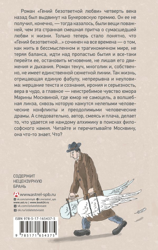 Роман "Гений безответной любви" четверть века назад был выдвинут на Букеровскую премию. Он ее не получил, конечно, — тогда казалось, были вещи поважней, чем эта странная смешная притча о сумасшедшей любви к жизни. Только теперь стало понятно, что "Гений безответной…" сочинен на все времена — о том, как жить в бессмысленном и трагикомичном мире, не теряя баланса, идти над пропастью бытия и все-таки перейти ее, остановить мгновение, не лишая его движения и дыхания.