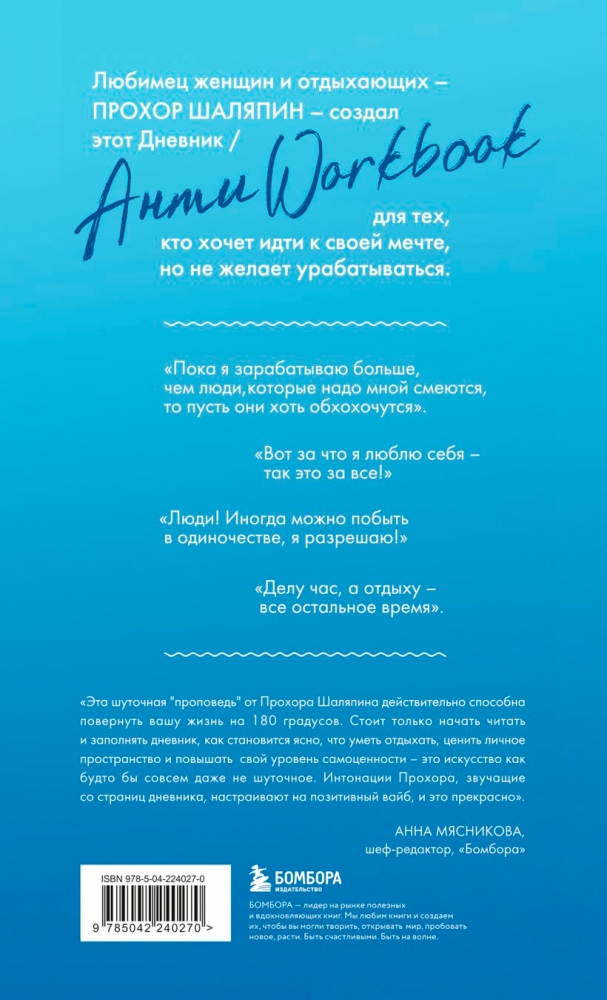 «Эта шуточная "проповедь" от Прохора Шаляпина действительно способна повернуть вашу жизнь на 180 градусов. Стоит только начать читать и заполнять дневник, как становится ясно, что уметь отдыхать, ценить личное пространство и повышать свой уровень самоценности — это искусство как будто бы совсем даже не шуточное. Интонации Прохора, звучащие со страниц дневника, настраивают на позитивный вайб, и это прекрасно». — Анна Мясникова, шеф-редактор, Бомбора