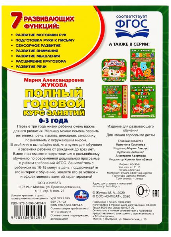 Учебное пособие «М.А. Жукова. Полный годовой курс занятий, 0-3 лет» ТМ «УМка» – полезная книга для обучения малыша:- соответствует ФГОС- яркие крупные иллюстрации.