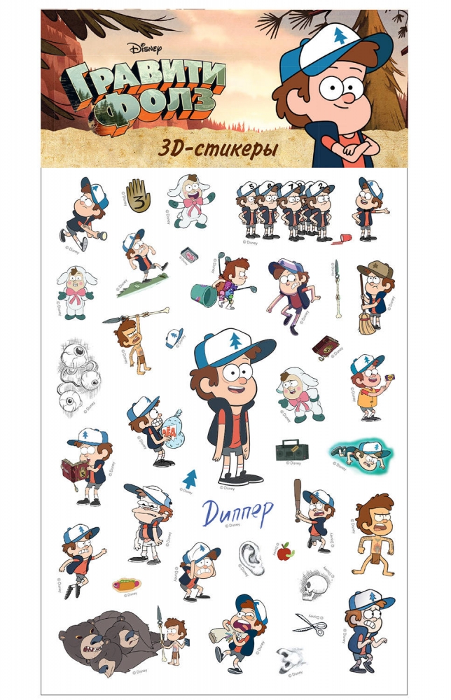 Укрась свои гаджеты, тетради и вообще все, что захочешь, замечательными пухлыми стикерами с героями любимого сериала! 38 3D-наклеек с Диппером и его супер-фразочками.