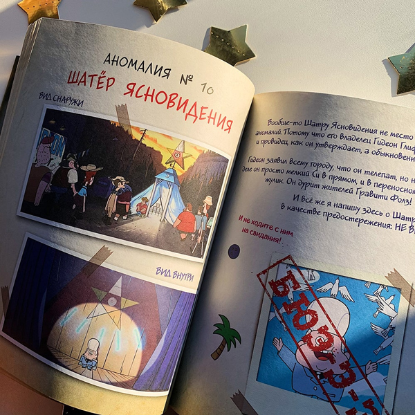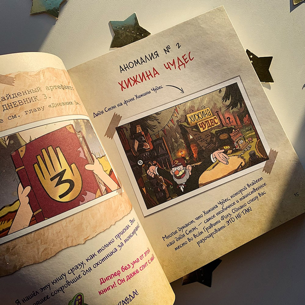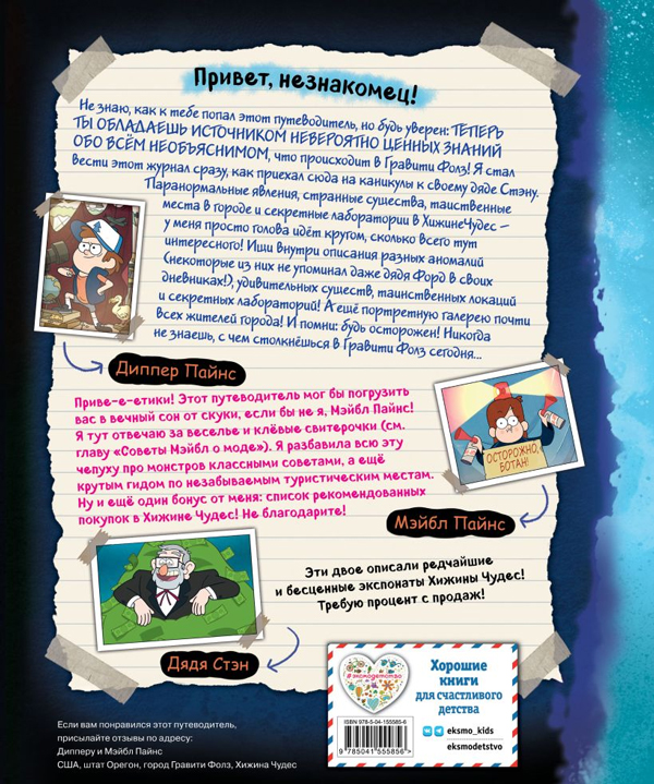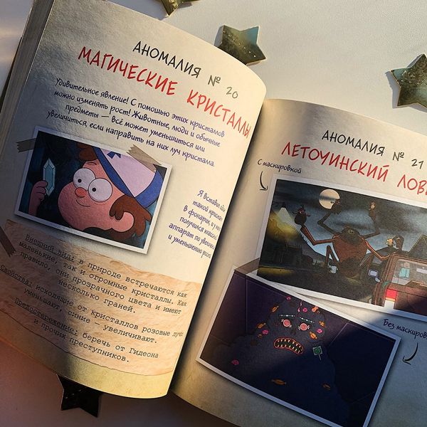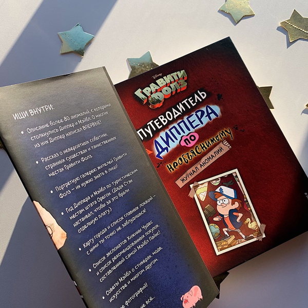 Эта удивительная книга — тот самый журнал Диппера по необъяснимому! В нём ты найдёшь невероятно много секретов и уникальных материалов: портретную галерею жителей Гравити Фолз, гид по туристическим ловушкам, описание более 80 аномалий — о многих из них Диппер рассказал впервые! Но это ещё не всё! Список экспонатов и сувениров Хижины Чудес (о, дядя Стэн будет в ярости!), советы Мэйбл о моде, стикерах и многом другом, море фотографий, карты, секретные локации — просто голова идёт кругом, сколько внутри всего интересного! Без этой книги не обойтись ни одному охотнику за монстрами!