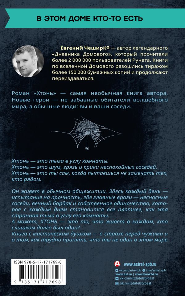 Евгений ЧеширКо — автор легендарного "Дневника Домового", который прочитали более 2 000 000 пользователей Рунета. Книги по вселенной Домового разошлись тиражом более 150 000 бумажных копий и продолжают переиздаваться.