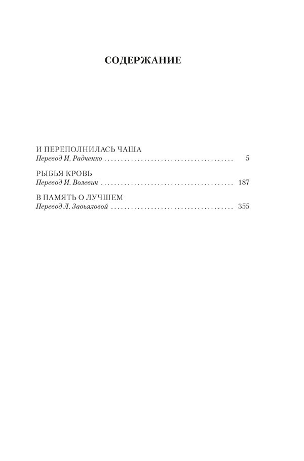 В своих книгах Саган, чутко настроенная на тонкие вибрации каждого дня, который она проживала, обращалась к историческим событиям нечасто. Однако в обоих романах, включенных в это издание, «И переполнилась чаша» и «Рыбья кровь», действие происходит в 1942 году, во время нацистской оккупации Франции, — их герои, пытаясь быть над схваткой и посреди всеобщего безумия держать иронический нейтралитет, в итоге вынуждены посмотреть в лицо фактам и выбрать сторону. А «В память о лучшем» — сборник воспоминаний Саган: о дружбе с Билли Холидей, Теннесси Уильямсом, Орсоном Уэллсом и Жан-Полем Сартром, о бурной молодости в Сен-Тропезе, о казино и книгах, о творчестве тех, кем она восхищалась, и о ее бескорыстной, беззаветной к ним любви.