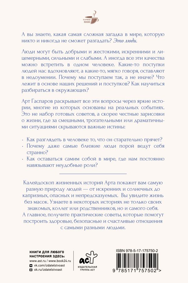 Арт Гаспаров, который уже много лет изучает природу человеческого поведения (начиная со времен обучения в МГИМО и работы в дипломатии), в своей новой книге раскрывает все эти вопросы через яркие истории, многие из которых основаны на реальных событиях. Это не набор готовых советов, а скорее честные зарисовки о жизни, где за смешными, трогательными или драматичными ситуациями скрываются важные истины:
