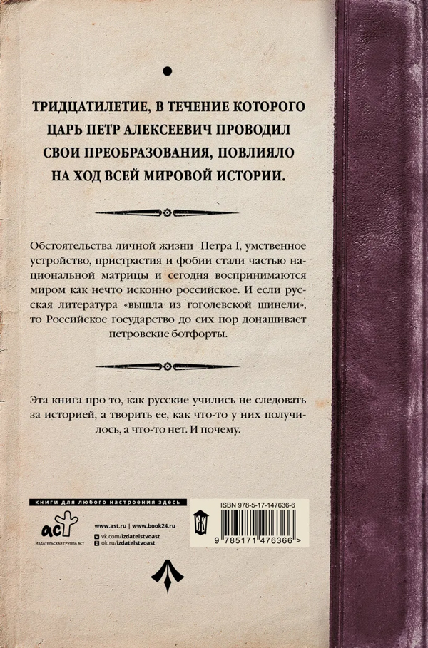 "Тридцатилетие, в течение которого царь Петр Алексеевич проводил свои преобразования, повлияло на ход всей мировой истории. Обстоятельства его личной жизни, умственное устройство, пристрастия и фобии стали частью национальной матрицы и сегодня воспринимаются миром как нечто исконно российское. И если русская литература "вышла из гоголевской шинели", то Российское государство до сих пор донашивает петровские ботфорты.