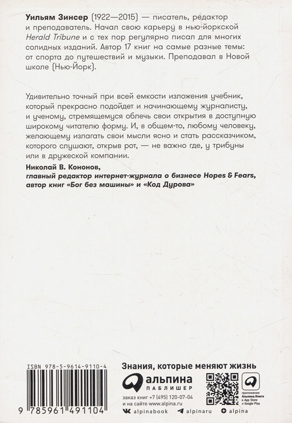 Уильям Зинсер, самый авторитетный преподаватель писательского ремесла из ныне живущих, в 30-м юбилейном издании своей книги, впервые выходящей на русском, обстоятельно рассказывает, как писать любые тексты на любую тему — о людях, о путешествиях, о себе, о технике, о спорте, об искусстве. Поясняет, какими правилами писатель должен руководствоваться, какими методами пользоваться и как относиться к своему труду, чтобы максимально приблизить его к совершенству.