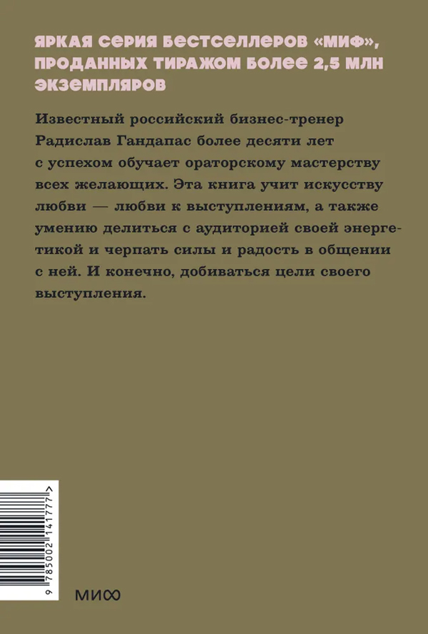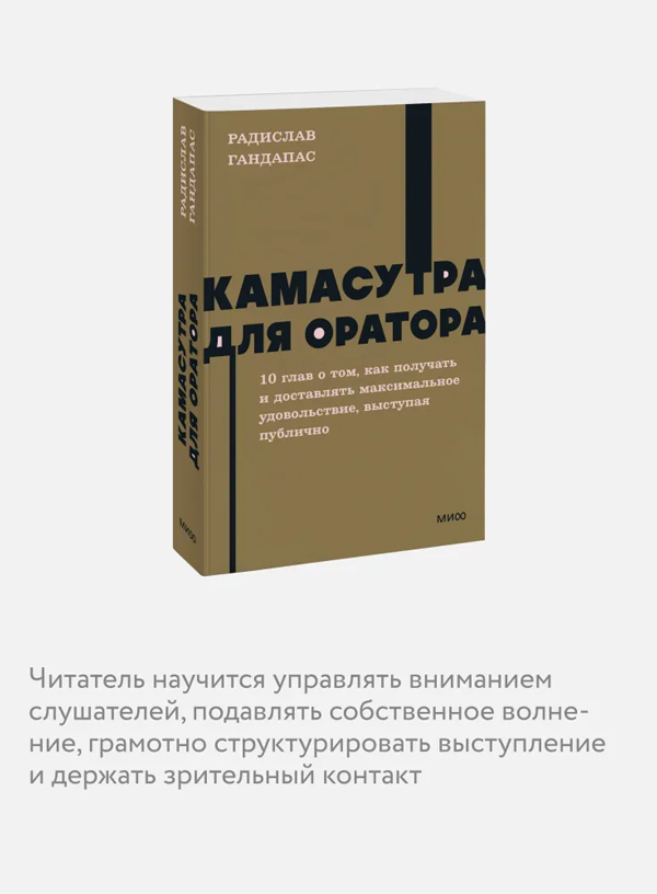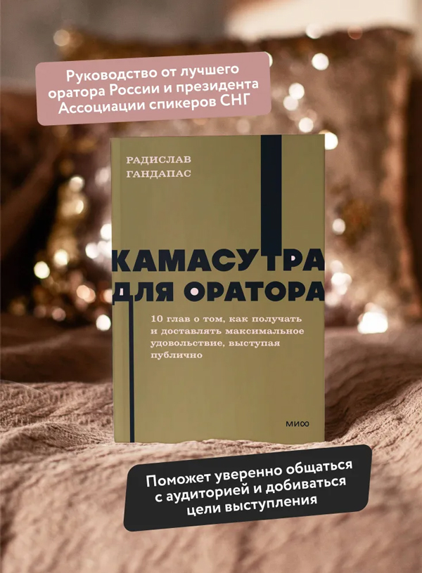 Известный российский бизнес-тренер Радислав Гандапас более десяти лет с успехом обучает ораторскому мастерству всех желающих. В этой книге он делится секретами обольщения публики и учит искусству любви — любви к выступлениям, а также умению делиться с аудиторией своей энергетикой и черпать силы и радость в общении с ней. И конечно, добиваться цели своего выступления.