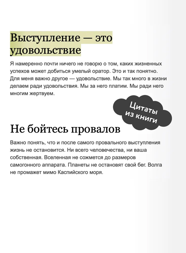 Тем не менее большинству из нас регулярно приходится произносить речи перед той или иной аудиторией. Удачное выступление может изменить судьбу отдельного проекта или ход истории, но кроме этого оно должно доставлять удовольствие и аудитории, и самому оратору.