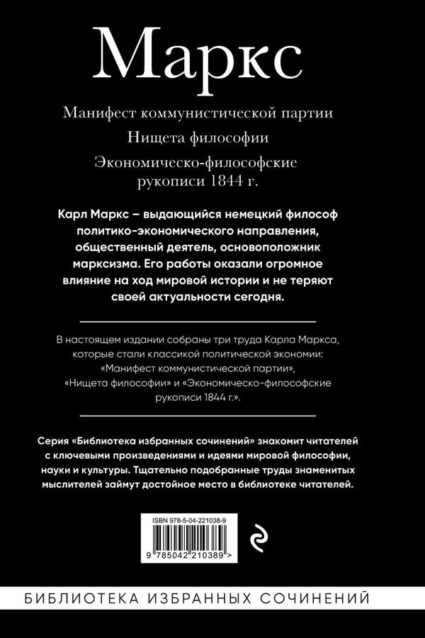 В данном издании представлены работы, которые положили начало экономической теории К. Маркса «Манифест Коммунистической партии» и «Нищета философии», а также одна из самых ранних и одновременно одна из самых цитируемых работ «Экономическо-философские рукописи 1844 г.».