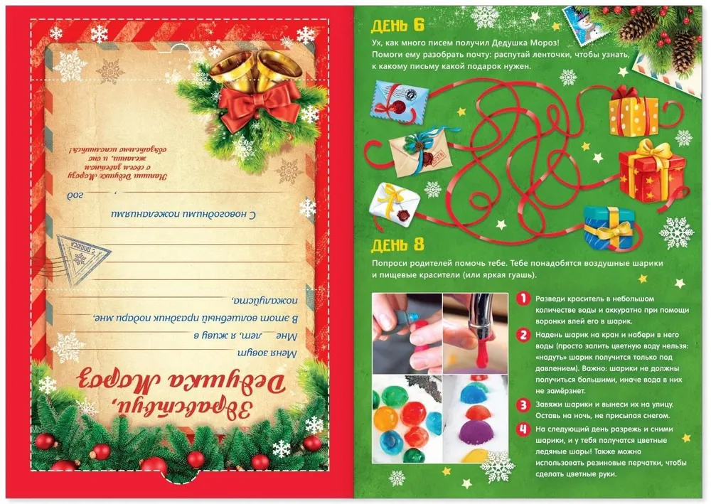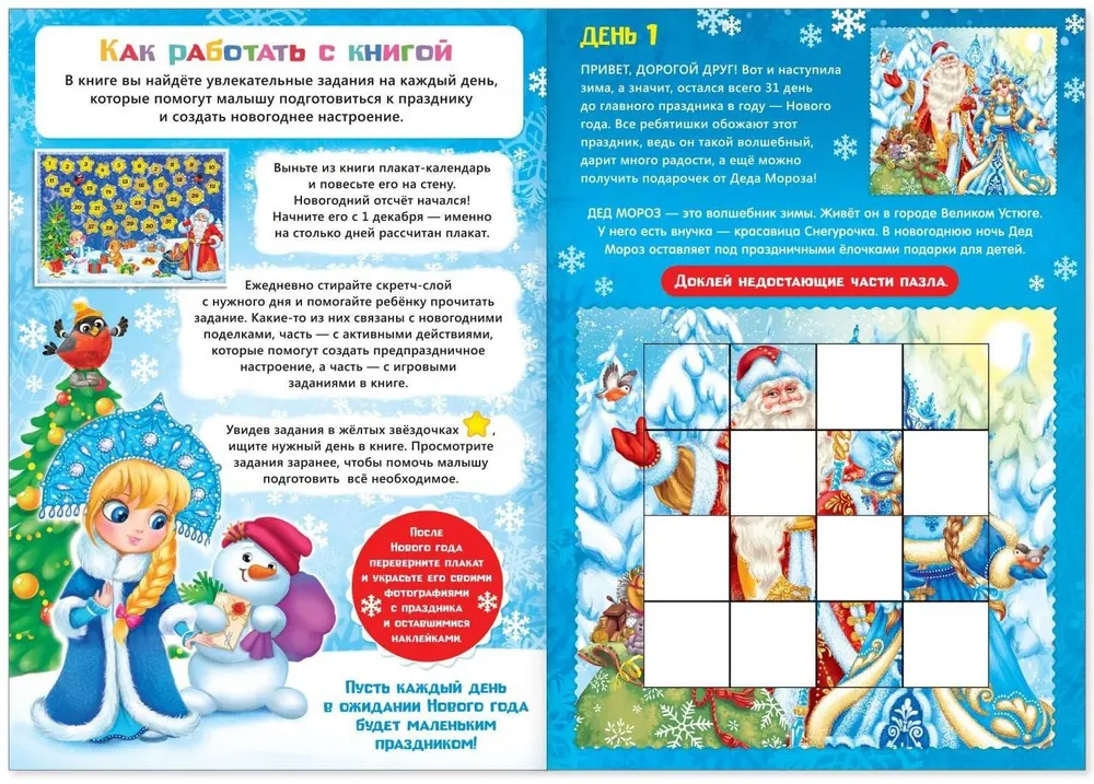 В течение всего декабря малыш будет выполнять задания и отмечать даты в календаре с помощью наклеек. Ребёнок напишет письмо Деду Морозу, раскрасит картинки, расшифрует слова, преодолеет лабиринты.