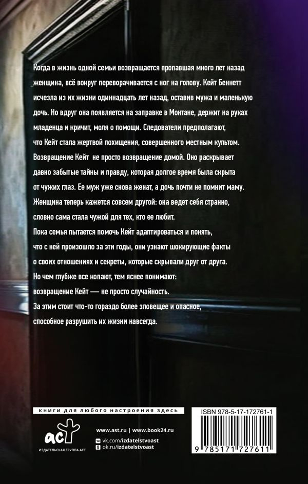 Возвращение Кейт — не просто возвращение домой. Оно раскрывает давно забытые тайны и правду, которая долгое время была скрыта от чужих глаз. Ее муж уже снова женат, а дочь почти не помнит маму. Женщина теперь кажется совсем другой: она ведет себя странно, словно сама стала чужой для тех, кто ее любит.