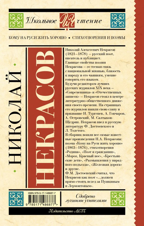 В сборник вошли все самые известные произведения Н.А. Некрасова: поэма "Кому на Руси жить хорошо" (1863–1876), стихотворения "Родина", "Поэт и гражданин", "Мороз, Красный нос", "Крестьянские дети", "Размышления у парадного подъезда", "Железная дорога" и другие.