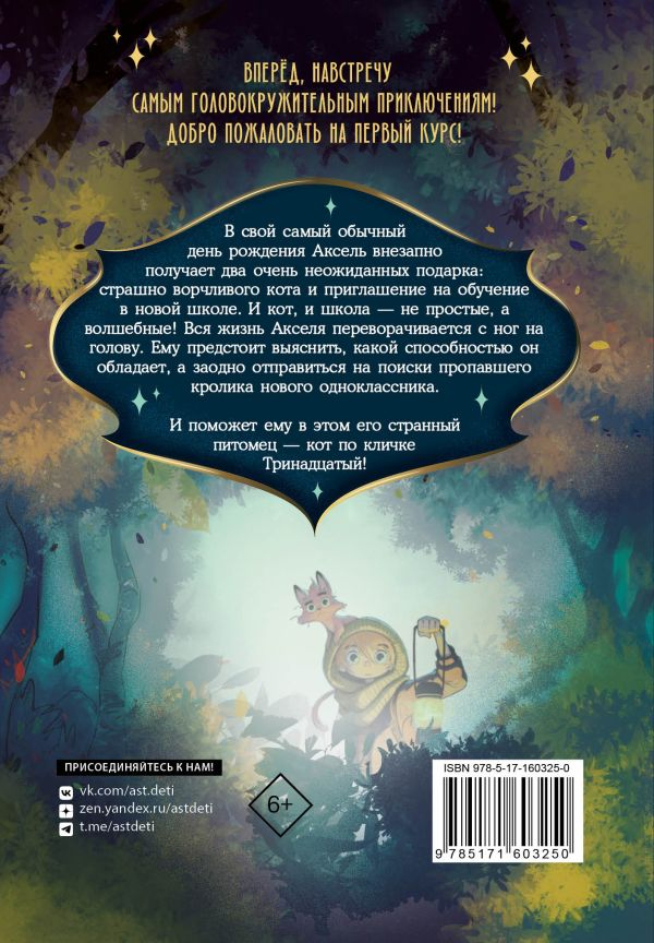 В свой самый обычный день рождения Аксель внезапно получает два очень неожиданных подарка: страшно ворчливого кота и приглашение на обучение в новой школе. И кот, и школа – не простые, а волшебные! Вся жизнь Акселя переворачивается с ног на голову. Ему предстоит выяснить, какой способностью он обладает, а заодно отправиться на поиски пропавшего кролика нового одноклассника. И поможет ему в этом его странный питомец – кот по кличке Тринадцатый!