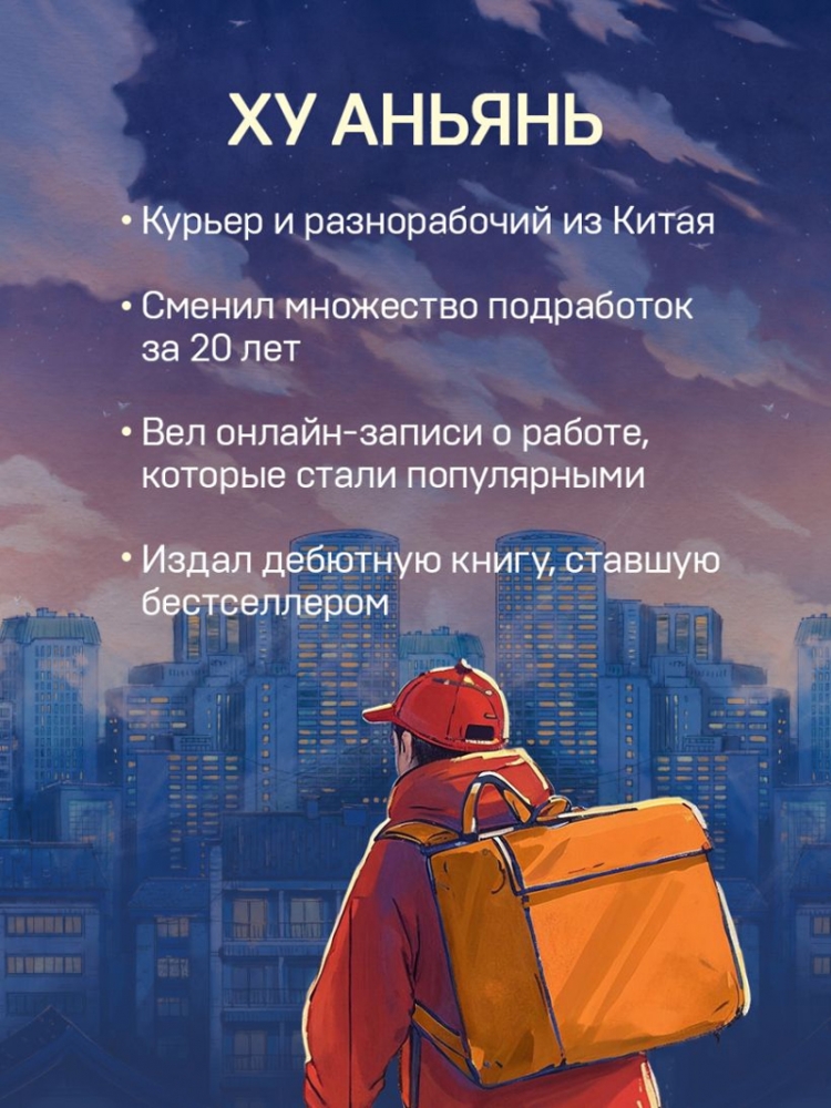Мемуары Ху Аньяня, разнорабочего из Китая — громкий голос тех, кто сегодня занимается ежеминутным, изнуряющим и незаметным трудом. Сменив множество подработок и доставив тысячу посылок, он рассказал свою историю о том, что значит оставаться человеком в условиях ограниченного выбора. И эта история теперь звучит по миру.