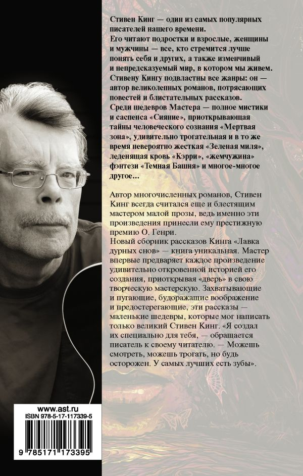 Новый сборник рассказов Кинга "Лавка дурных снов" — книга уникальная. Мастер впервые предваряет каждое произведение удивительно откровенной историей его создания, приоткрывая "дверь" в свою творческую мастерскую. Захватывающие и пугающие, будоражащие воображение и предостерегающие, эти рассказы — маленькие шедевры, которые мог написать только великий Стивен Кинг.