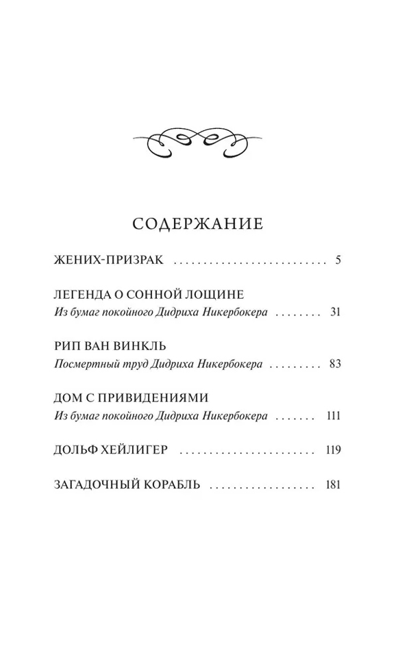 В книгу вошли и другие новеллы Ирвинга — "Жених-призрак", "Рип ван Винкль", "Дом с привидениями", "Дольф Хейлигер", "Загадочный корабль".