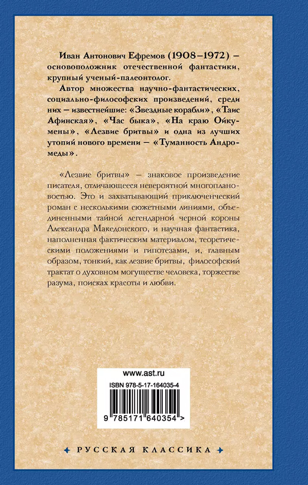 "Лезвие бритвы" — знаковое произведение писателя, отличающееся невероятной многоплановостью. Это и захватывающий приключенческий роман с несколькими сюжетными линиями, объединенными тайной легендарной черной короны Александра Македонского, и научная фантастика, наполненная фактическим материалом, теоретическими положениями и гипотезами и, главным образом, тонкий, как лезвие бритвы, философский трактат о духовном могуществе человека, торжестве разума, поисках красоты и любви.
