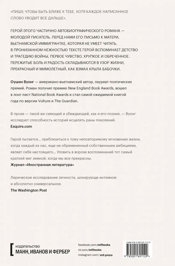 Лиричный роман о том, что прекрасные мгновения вплетены в ткань жизни. Молодой писатель пишет письмо-исповедь неграмотной матери и вспоминает семейную историю, хрупкую первую любовь, поиски себя и попытки остаться собой несмотря на жестокость мира.