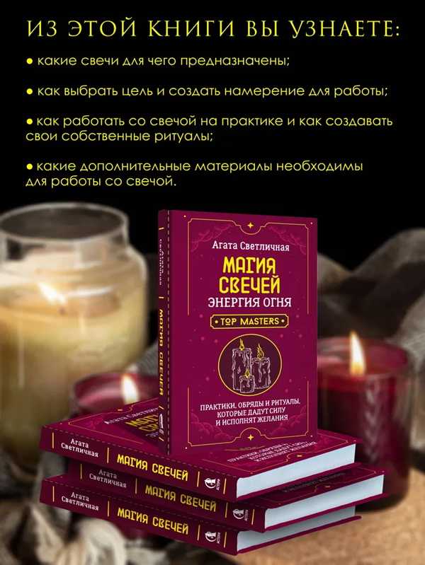 Эта книга написана не для того, чтобы рассказать, какие бывают свечи или как их создавать. Подобную информацию вы легко можете найти в открытом доступе. Гораздо ценнее практическая часть: вы узнаете, как выбрать и подготовить свечи к практике, познакомитесь с готовыми ритуалами для самых разных жизненных ситуаций и научитесь создавать собственные.