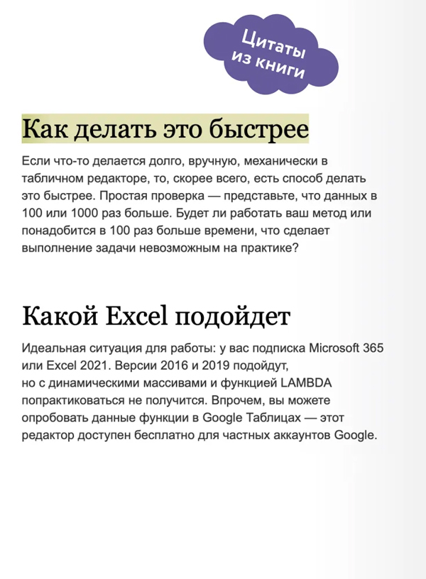 В качестве примеров даны не только скриншоты из настоящей рабочей практики с пометками и комментариями. В книге есть ссылка на файлы примеров — рабочие книги Excel, где можно практиковаться самостоятельно и работать с формулами и таблицами из книги.