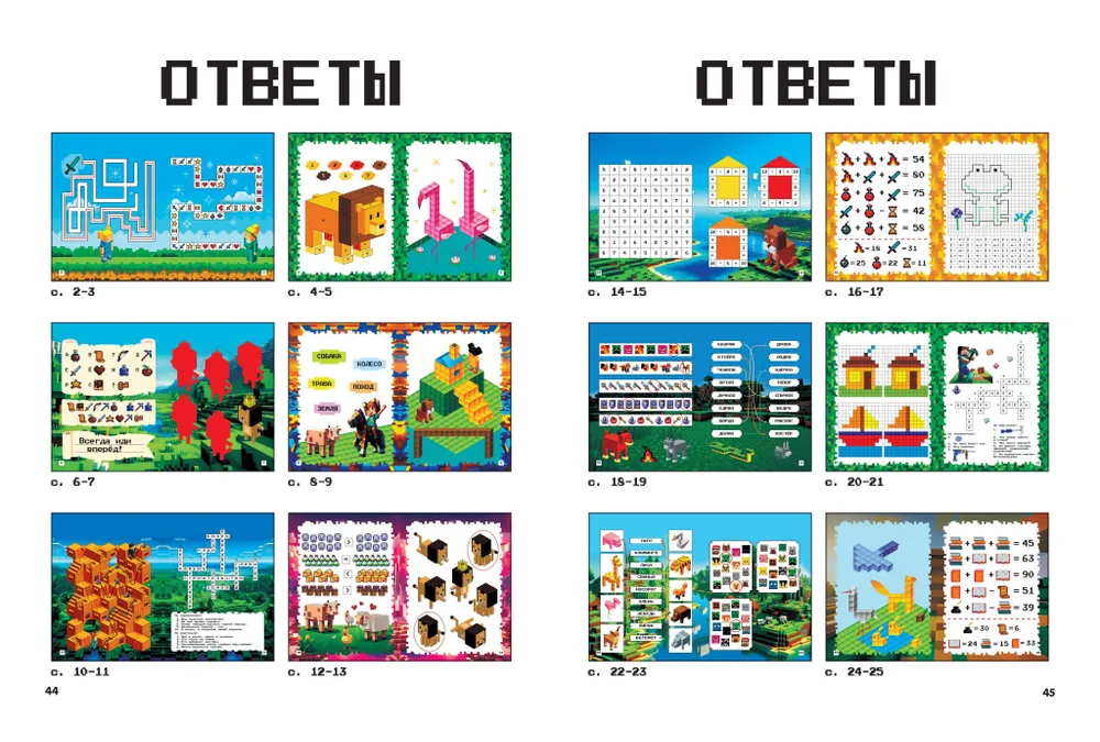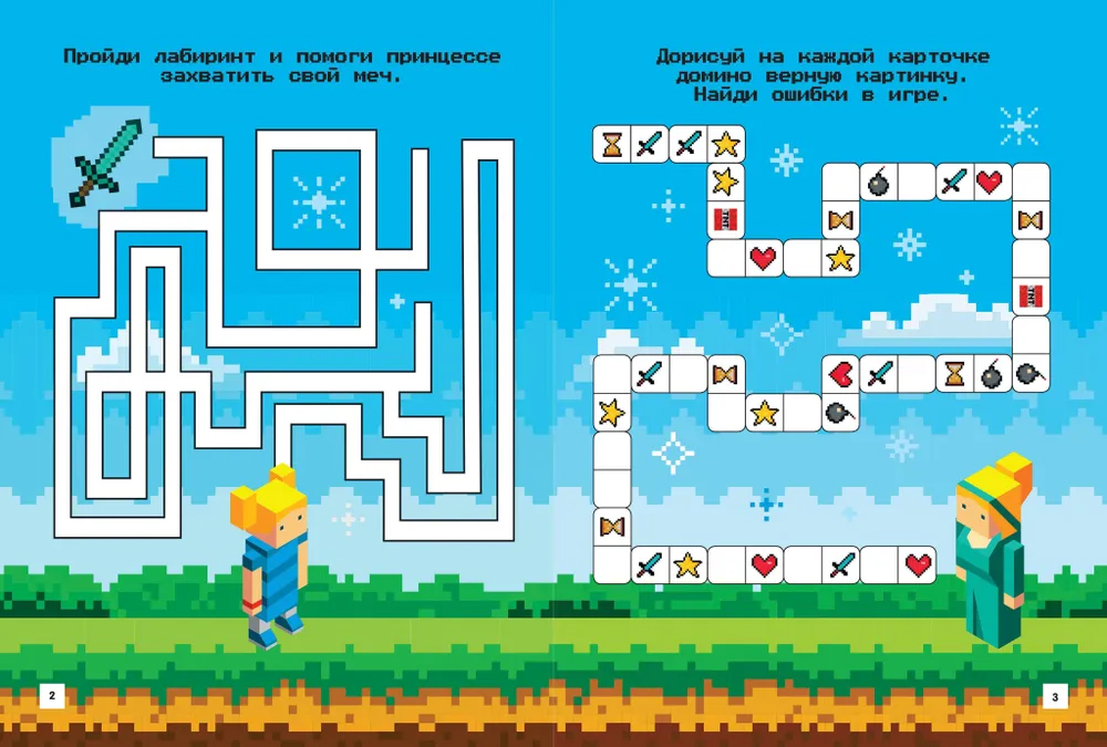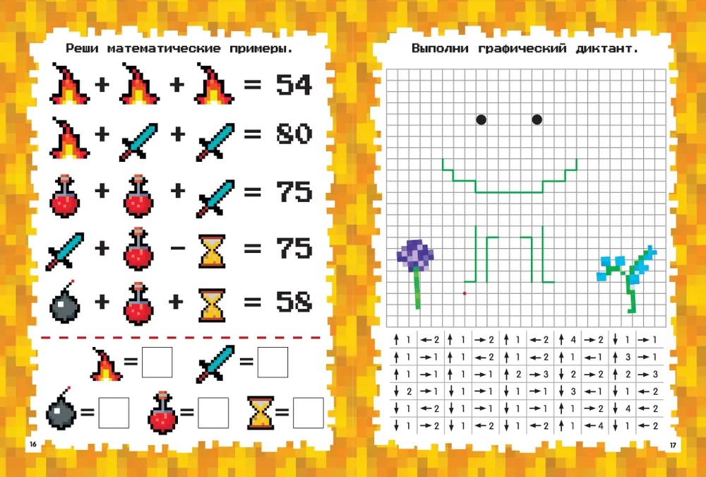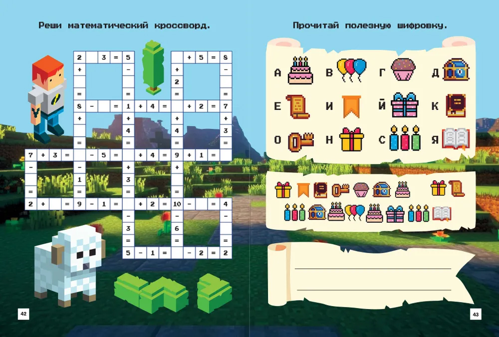 Ребёнка ждут занимательные шифровки, логические задачки, судоку, кроссворды, лабиринты, рисунки по точкам, разные виды раскрасок, задания на внимание, память, мышление и, конечно, пиксельные картинки.