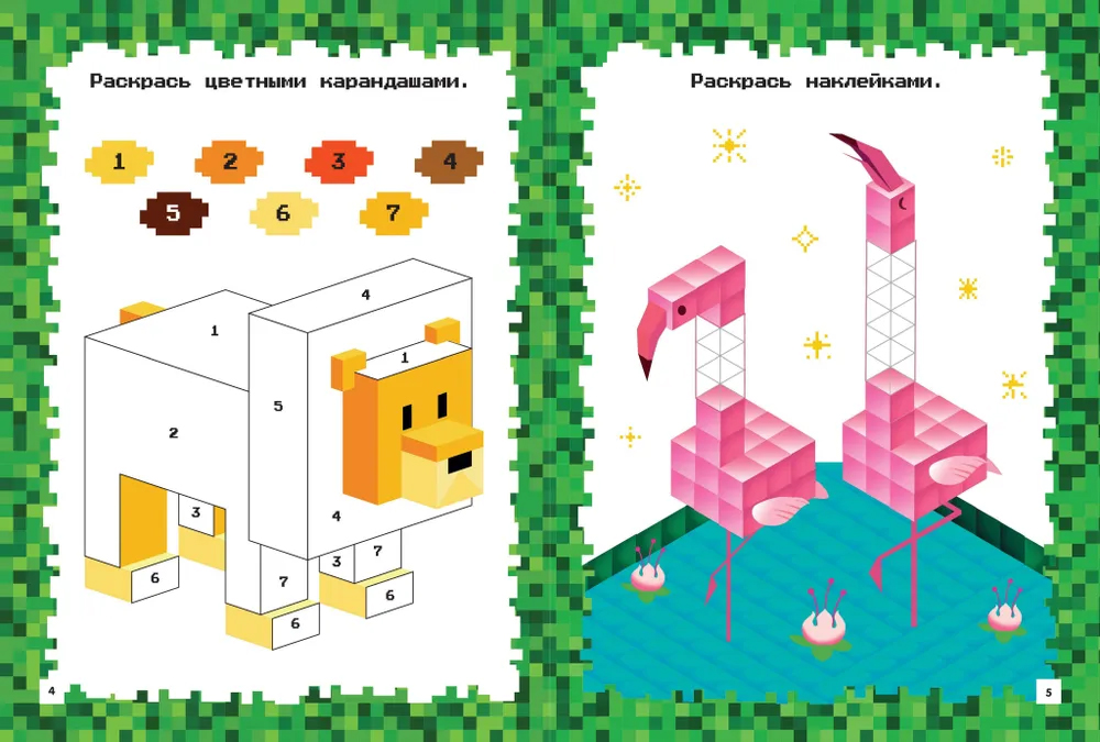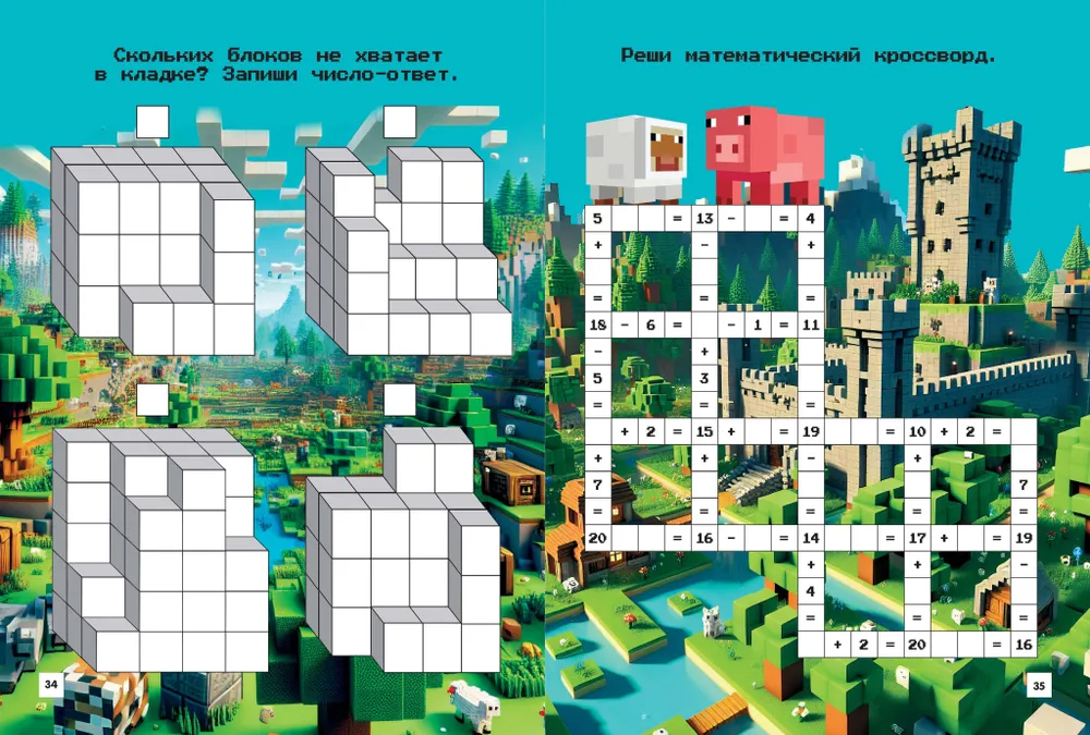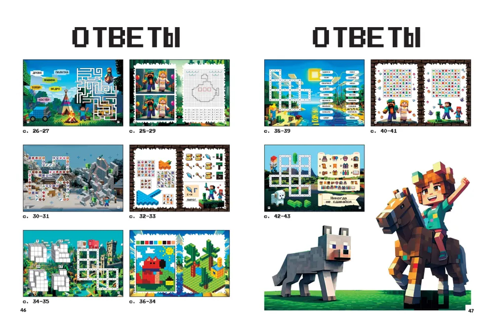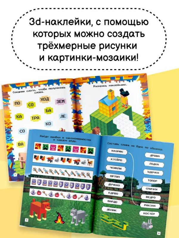 Книга "Майнкрафт. Головоломки и раскраски" — лучший способ отвлечься от гаджетов. Книга большого формата, имеет 48 цветных страниц, оформлена в стиле популярной компьютерной игры. Бонус — 3D-наклейки, с помощью которых можно создать трёхмерные рисунки и картинки-мозаики.