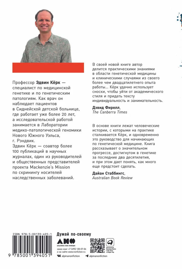В отличие от терапевта, сопровождающего пациента от колыбели до могилы, врач-генетик следит за его жизнью еще до ее зарождения и спустя годы после ее завершения. За время своей профессиональной деятельности доктору Кёрку довелось принимать участие в судьбах тысяч людей, и этот период совпал с эпохой небывалого прорыва в генетике. Опыт практикующего врача и ученого в сочетании с даром рассказчика позволили автору написать великолепный обзор истории медицинской генетики и оценить ее перспективы, проясняя на реальных примерах самые сложные вопросы для всех желающих постичь тонкости этой новой науки.