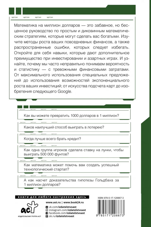Математика на миллион долларов поможет вам разобраться в том, как превратить 1000 долларов в 1 миллион; каков наилучший способ выиграть в лотерею; когда лучше всего брать кредит; как одна группа игроков сделала ставку на лунки, чтобы выиграть 500 000 фунтов; как математика может помочь вам создать успешный технологический стартап.