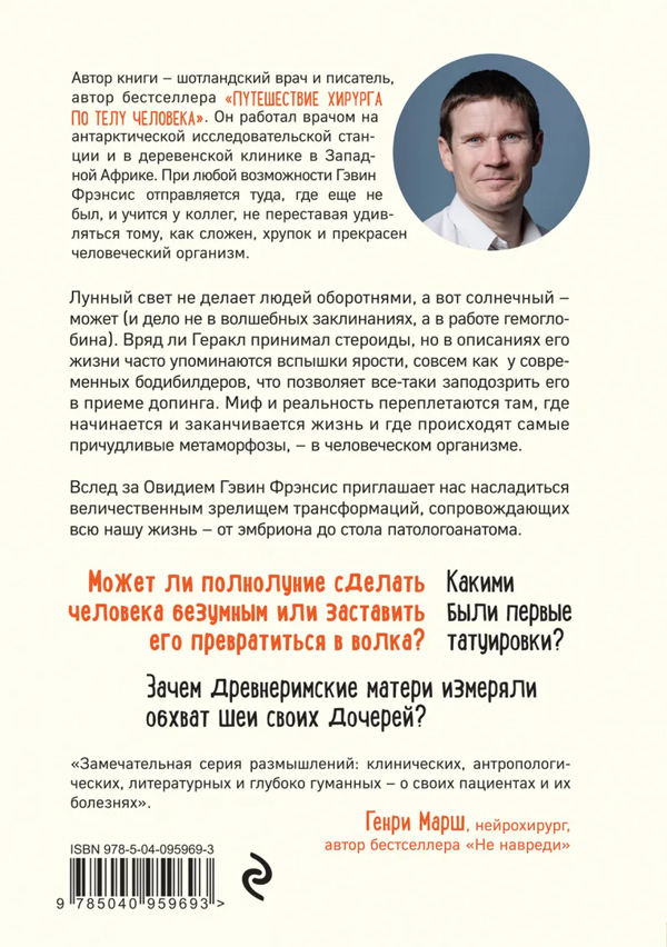 Гэвин Фрэнсис исследует самые живучие мифы и объясняет их природу. Он обращается к изменениям в теле своих пациентов, как долгожданным, так и нежелательным и объясняет, почему эти метаморфозы не случайны и важны для всего человечества. Все свои мысли автор подкрепляет случаями из практики и рассказами из истории медицины, искусства, литературы, мифов.