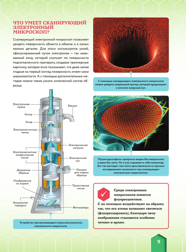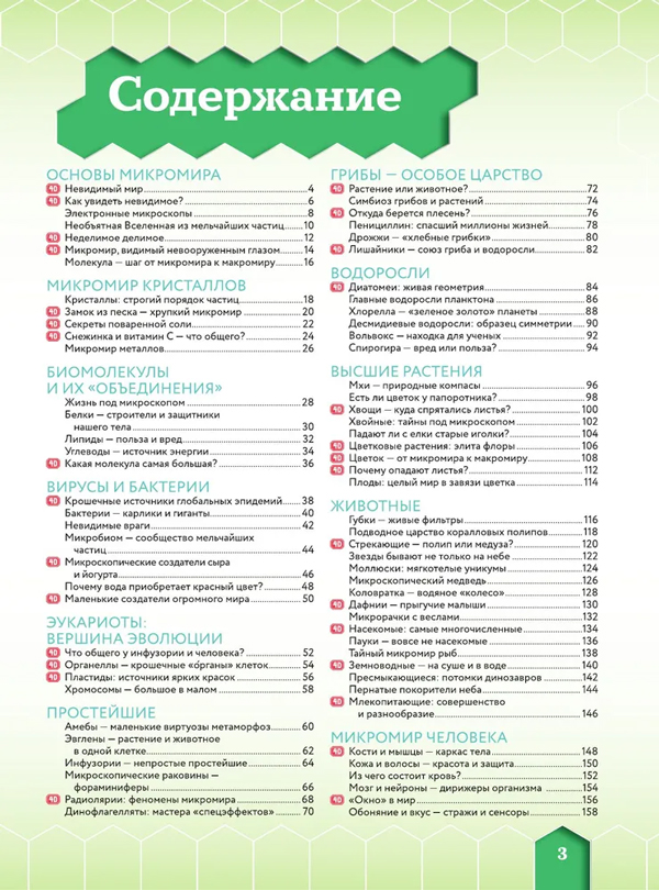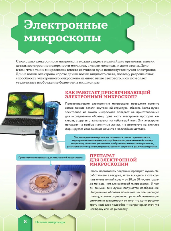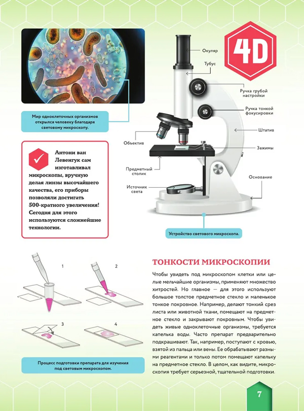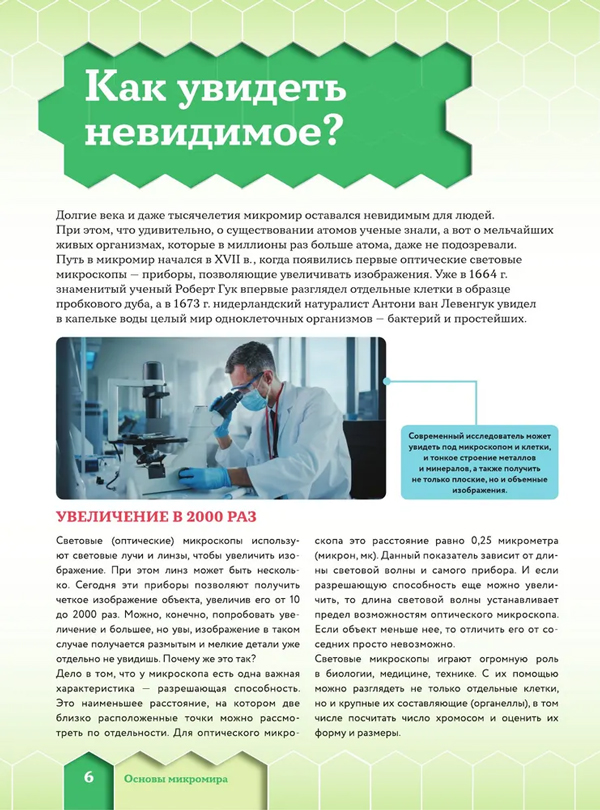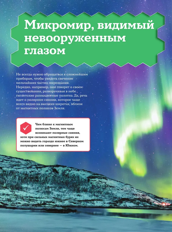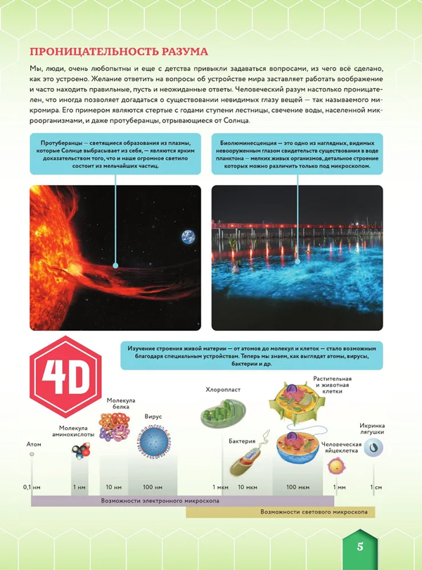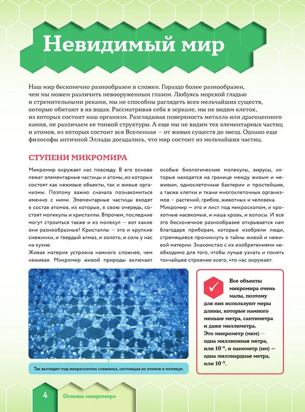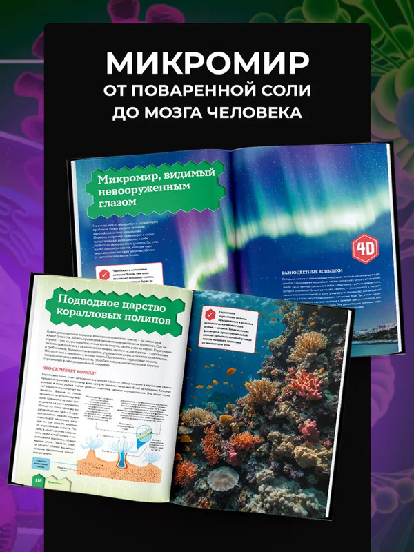 Многочисленные наглядные схемы и рисунки, большое количество зрелищных фотографий, полученных благодаря световой и электронной микроскопии, а также лучшие образцы макросъемки помогут вам разглядеть настоящее волшебство, скрытое в самых разных объектах и явлениях микромира — от полярного сияния до цветения воды, от неспешного передвижения микроскопического "медведя" под названием тихоходка до порхания резво машущих крылышками миниатюрных колибри.