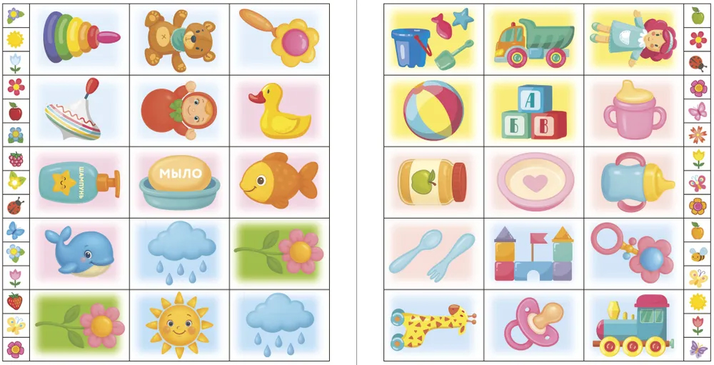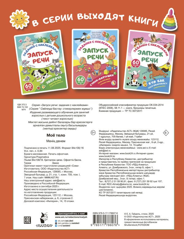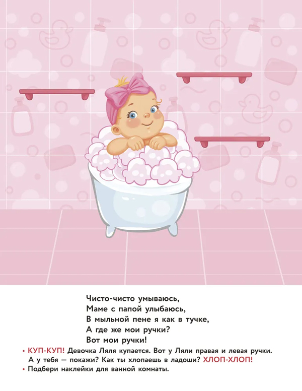 На каждой странице — крупные картинки + весёлые стихи для повторения с ребёнком. Рассказывайте истории по картинкам, задавайте вопросы и сами на них отвечайте, читайте стихи медленно и выразительно. На первых порах малыш будет слушать и показывать на иллюстрации, а затем начнёт повторять слова, фразы и строчки из стихотворений. С яркими наклейками учиться говорить намного веселее! В книге 60 крупных стикеров с хорошей печатью, легко отделяются от основы — идеально подойдут для детских пальчиков и разовьют познавательную активность.
