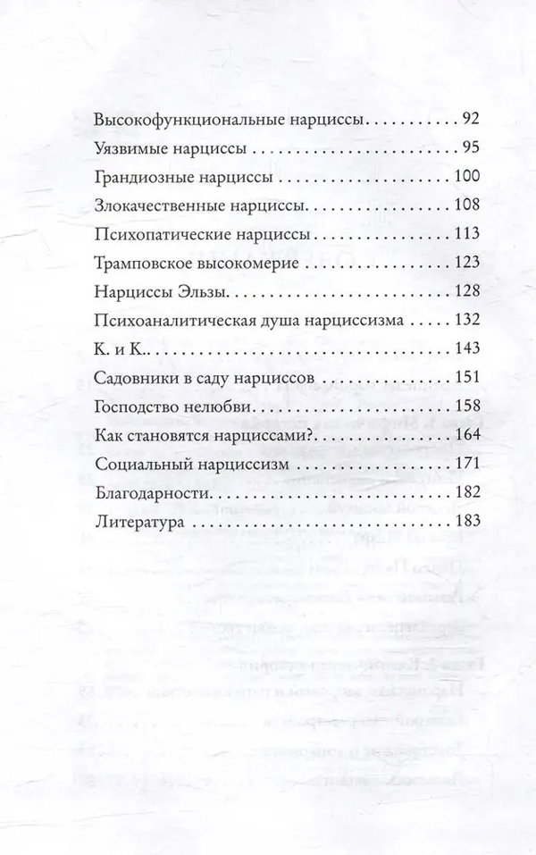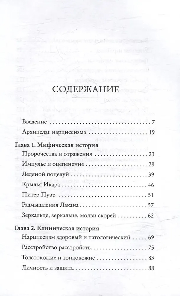Путешествию по этому архипелагу посвящено исследование психоаналитика Витторио Линджарди. Начав с мифов и художественных произведений, автор приходит к разбору классических клинических исследований (Лакан и Фрейд) и новейших теорий XXI века, иллюстрируя каждый оттенок нарциссизма примерами из литературы и кинематографа.