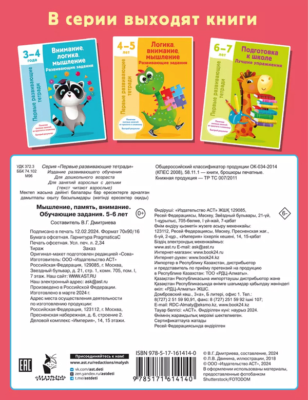 Возраст 5–6 лет очень важен для ребёнка. Совсем скоро ему предстоит стать учеником, поэтому родители уже начинают готовить малыша к школе. В помощь мамам, папам, бабушкам и дедушкам разработан полезный тренажёр «Мышление, память, внимание. Обучающие задания. 5-6 лет». В нём собраны задания на самые различные темы. Занятия помогут ребёнку развить логику, мышление, память, воображение и мелкую моторику. Будущий ученик научится решать весёлые логические задачки, рисовать по клеточкам и точкам, подготовит руку к письму, потренирует пространственное мышление, внимание и память. Самое важное, что все задания поданы в игровой форме, поэтому ребёнку не будет скучно! Вперёд — навстречу новым знаниям!