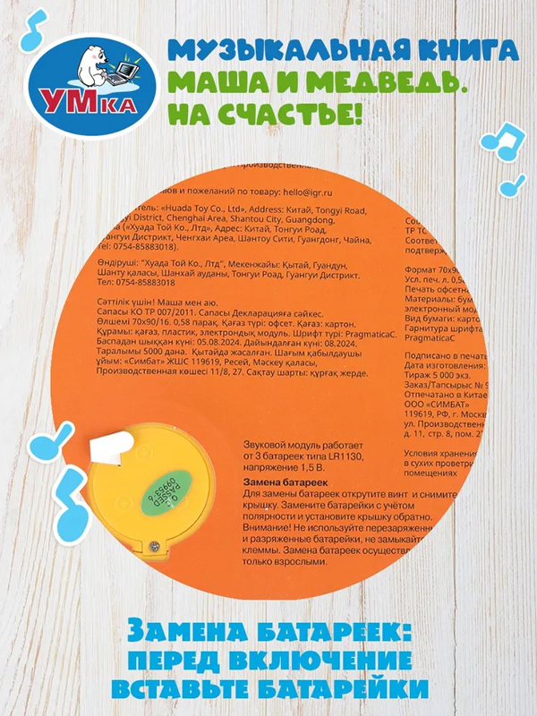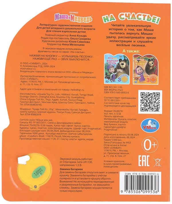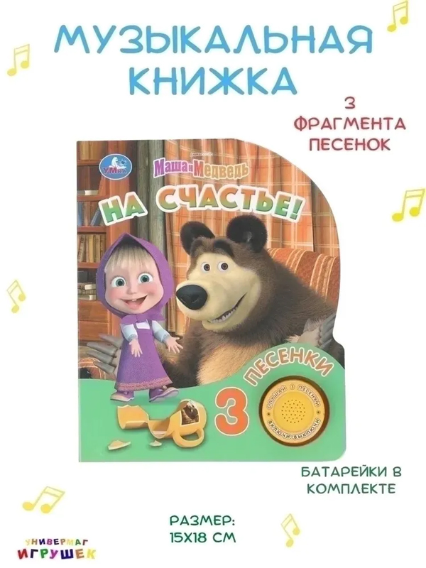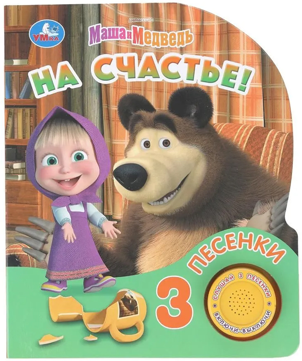 Музыкальная книга «Маша и Медведь. На счастье!» ТМ «УМка» станет прекрасным подарком для маленьких поклонников известного мультсериала про непоседливую и любознательную девочку и её друга Мишку: