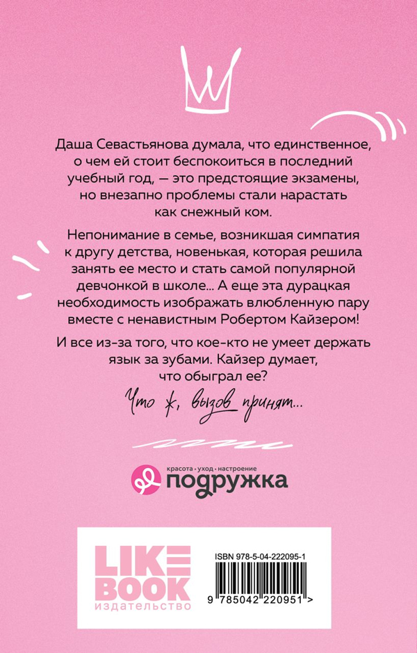 Даша Севастьянова думала, что единственное, о чем ей стоит беспокоиться в последний учебный год, – это предстоящие экзамены, но внезапно проблемы стали нарастать как снежный ком. Непонимание в семье, возникшая симпатия к другу детства, новенькая, которая решила занять ее место и стать самой популярной девчонкой в школе… А еще эта дурацкая необходимость изображать влюбленную пару вместе с ненавистным Робертом Кайзером! И все из-за того, что кое-кто не умеет держать язык за зубами. Кайзер думает, что обыграл ее? Что ж, вызов принят…