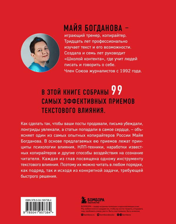 В этой книге собрано 99 самых эффективных приемов текстового влияния. Как сделать так, чтобы ваши посты продавали, письма убеждали, лонгриды увлекали, а статьи попадали в самое сердце, — объясняет один из самых опытных копирайтеров России Майя Богданова. В основе предлагаемых ею приемов лежат принципы психологии влияния, НЛП-техники, наработки известных копирайтеров и другие способы воздействия на сознание читателя. Каждая из глав посвящена одному инструменту текстового влияния. Поэтому их можно читать в любом порядке, как подряд, так и исходя из конкретной задачи, требующей быстрого решения.