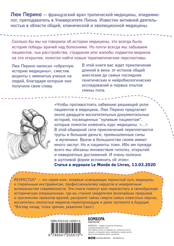 Книга Люка Перино посвящена пациентам, чьи случаи двигали медицину вперед и сделали ее такой, какой мы знаем сейчас. Вас ждет интересное приключение длиной в несколько веков, во время которого вы станете наблюдателем первых экспериментов с анестезией, испытаний вакцин, лечения истерии и других медицинских событий. Автор "Нулевого пациента" рассказывает о тех людях, которые терпеливо, в сельских больницах или на приемах у практикующих врачей, предоставляли свое тело для исследований. Возможно, не все из них до конца понимали, какой вклад в развитие медицины они вносят, но именно их участие сделало лечение многих заболеваний эффективным и успешным.